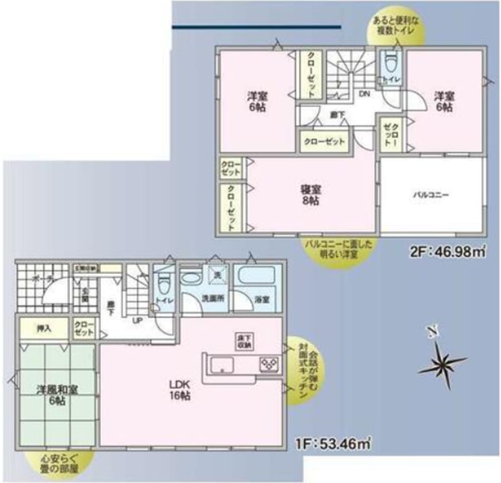 | 設備 | システムキッチン・カウンターキッチン・浄水器・TVモニタ付きインターホン・ディンプルキー・防犯カメラ・火災警報器(報知機)・温水洗浄便座・浴室乾燥機・トイレ2箇所・ルーフバルコニー・床下収納・複層ガラス |