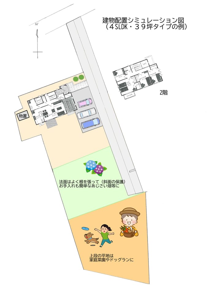 | 備考 | 下段の平地部分の宅地有効面積355.65㎡(107.58坪)。 原野545.44㎡(164.99坪)。法面、上段の平地。家庭菜園やドッグラン等に利用可。 別途宅延93.20㎡、通行地役権設定。 下水道取出し要(420円/㎡)。上水道引込要(91,300円)。 セットバック約0.3㎡。 |