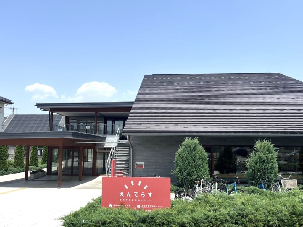 塩尻市役所広丘支所・えんてらすまで1.2km(車5分)市役所支所・公民館・図書館・子育て支援センターが一体となった複合施設。交流スペースや人工芝広場、マルシェなど地域の世代を超えた対話と居場所づくりを促す拠点です。