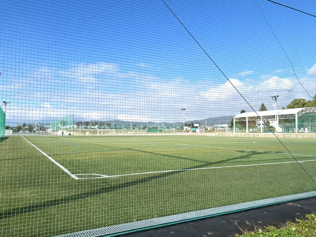 かりがねサッカー場まで800m(徒歩10分)天然芝グラウンドと人工芝グラウンド、雨天時も快適に利用できる屋根付きの多目的広場があるサッカー場。西方には北アルプスを眺望でき、松本山雅の練習場としても有名です。
