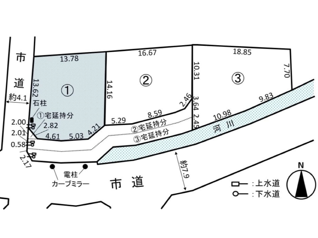 | 備考 | ・宅地延長道路には全区画の通行地役権を設定し、 分譲地の全所有者様が全幅通行可能とします。 ・河川法保全区域に該当するため、建物配置計画によっては 建築時に松本建設事務所への許可が必要です。 |