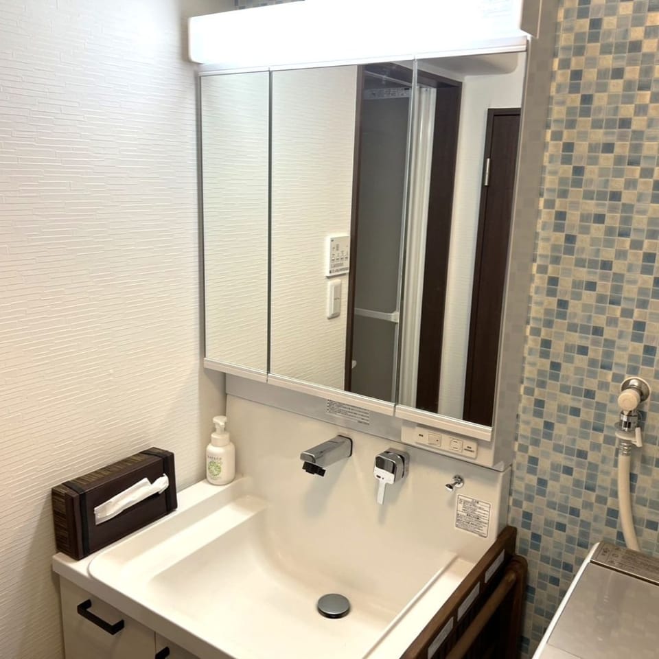 2022年に新品交換済の洗面化粧台。生活感が出にくいお洒落なタイル風クロスがポイント。