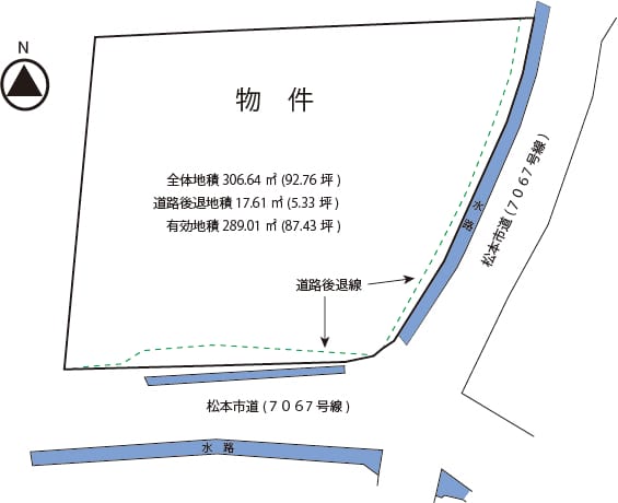 | 備考 | 都市計画法第34条第11号指定区域 水路占用許可が必要です 道路後退(セットバック)があります |