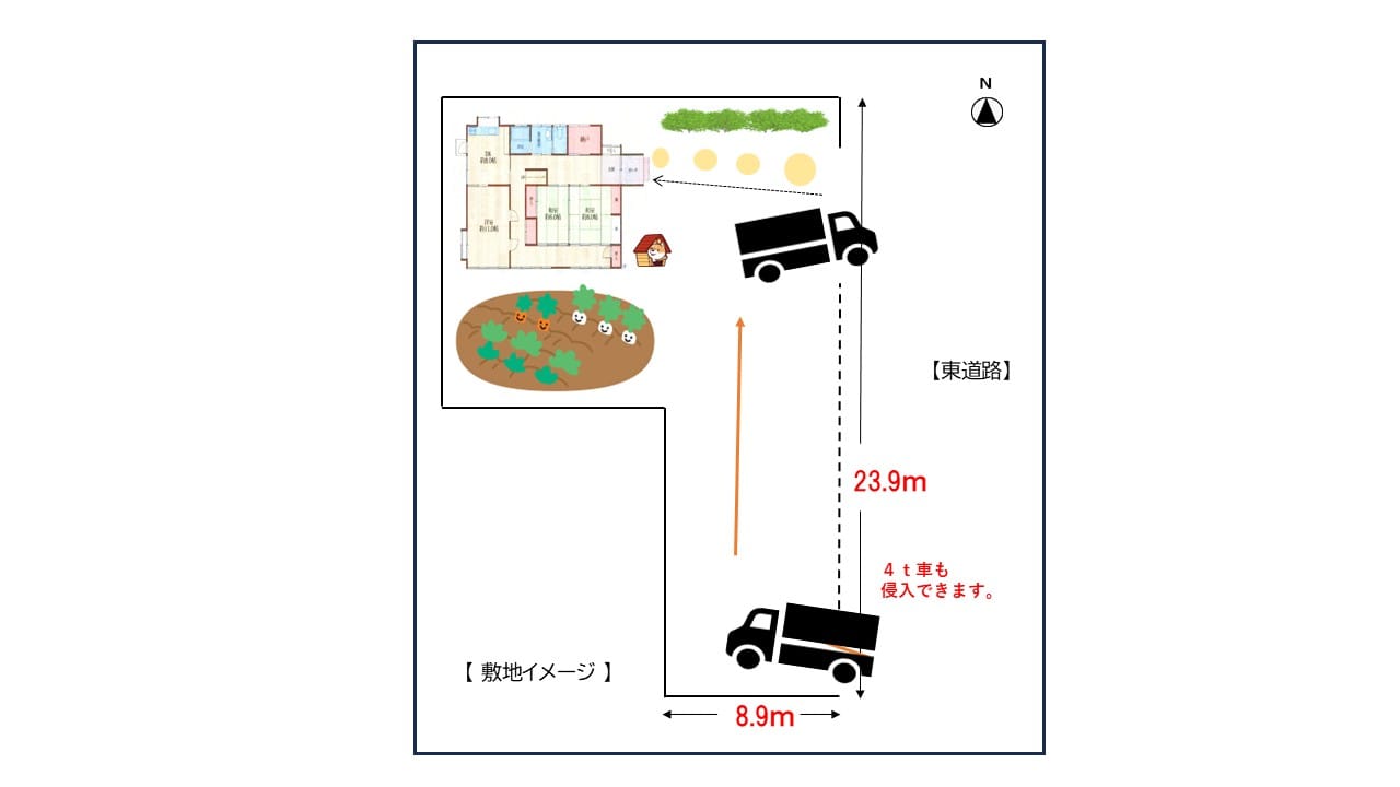 | 備考 | 敷地内駐車8台。大型車進入可能。 接道 東 公道 幅員16m(道路幅員10m+歩道東西に各3ⅿ) 間口23.9m。 見通し良い。 |