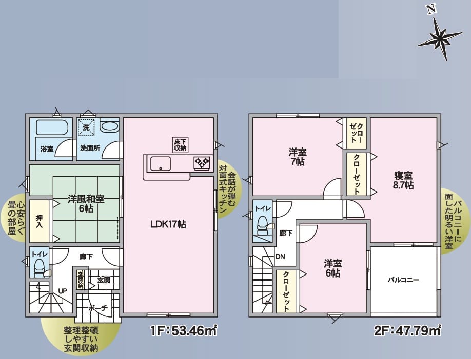 | 備考 | 〇TVモニター付きインターフォン 〇浴室乾燥機 〇温水洗浄便座 〇洗面化粧台 〇ペアガラス 〇システムキッチン 〇1坪UB 〇手すり付き階段 〇人感センサーライト 〇防犯カメラ |