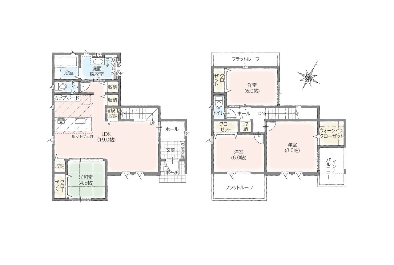 - 間取4LDK(1階 LDK:19.0帖 和:4.5帖 2階 洋:8帖 洋:6帖 洋:6帖)