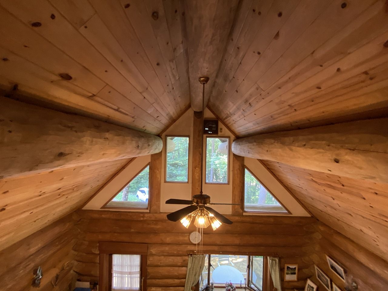 リビングのシーリングファン付き照明、薪ストーブ、ドア、窓はカナダ製を使っている物件です