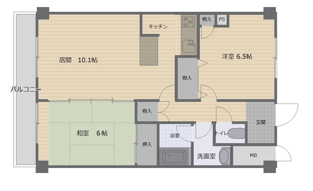 • 間取2LDK(リビング10.1帖、洋室6.5帖、和室6帖)