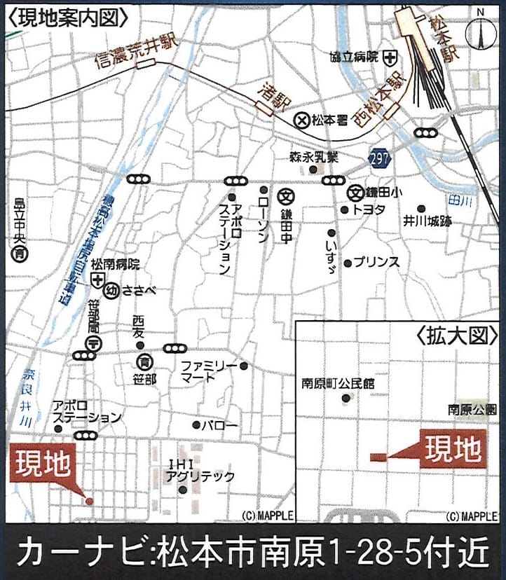 | 交通 | 電車:篠ノ井線南松本駅 距離2300m 徒歩29分 自動車7分 電車:篠ノ井線平田駅 距離3100m 徒歩39分 自動車10分 バス:南部循環線 バス停南原 距離350m 徒歩5分 最寄り駅までバス乗車14分 高速道路:長野道 松本I.C. 車8分 |