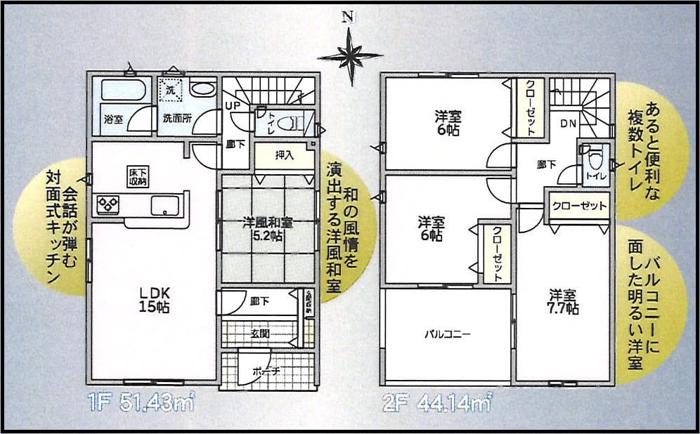 - 間取4LDK(1階:LDK15 和5.2 2階:洋6 洋6 洋7.7)