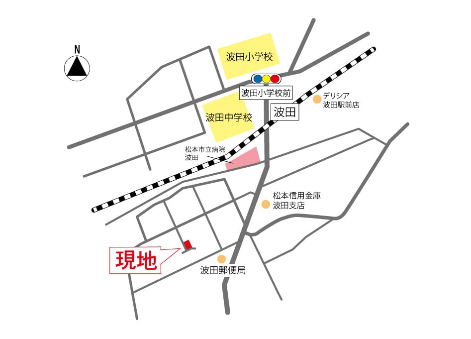 | 交通 | 電車:松本電気鉄道波田駅 距離750m 徒歩10分 自動車2分 電車:篠ノ井線松本駅 距離11500m 自動車26分 バス:波田循環バス線 バス停波田駅 距離750m 徒歩10分 高速道路:長野道 松本I.C. 車16分 |