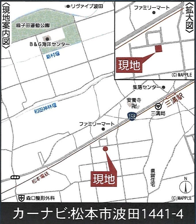 | 交通 | 電車:松本電気鉄道三溝駅 距離500m 徒歩7分 自動車2分 電車:篠ノ井線松本駅 距離7800m 自動車18分 高速道路:長野道 松本I.C. 車10分 |