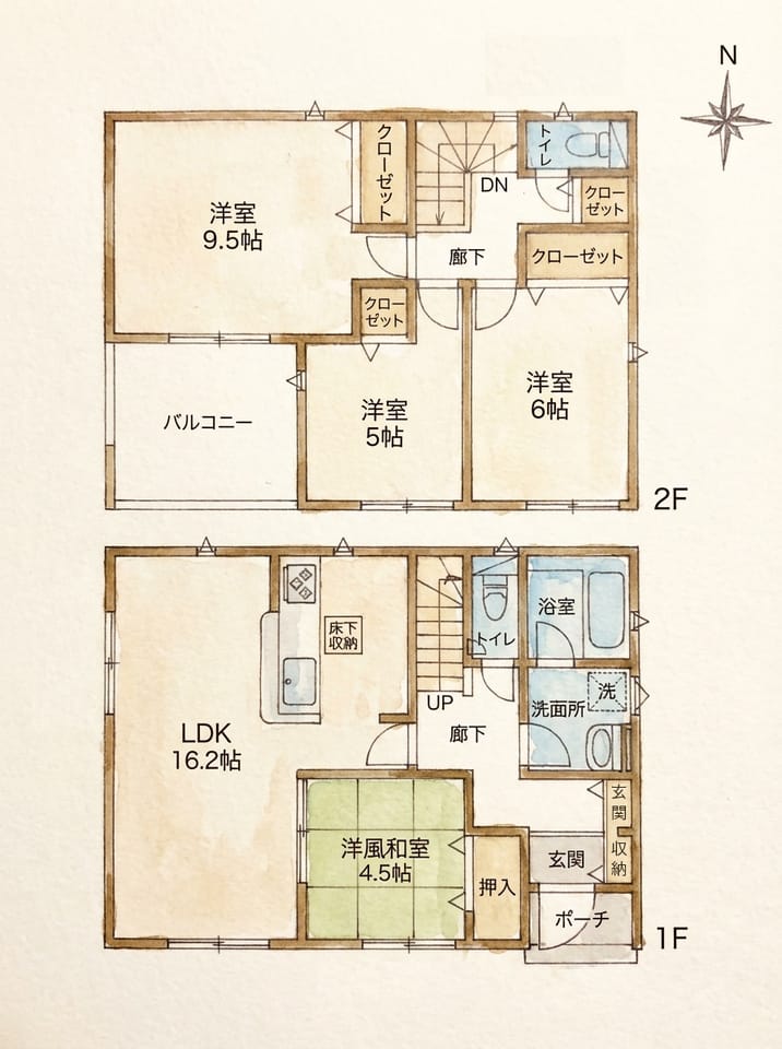 | 間取 | 4LDK(1階:LDK16.2 和4.5 2階:洋9.5 洋6 洋5) |
