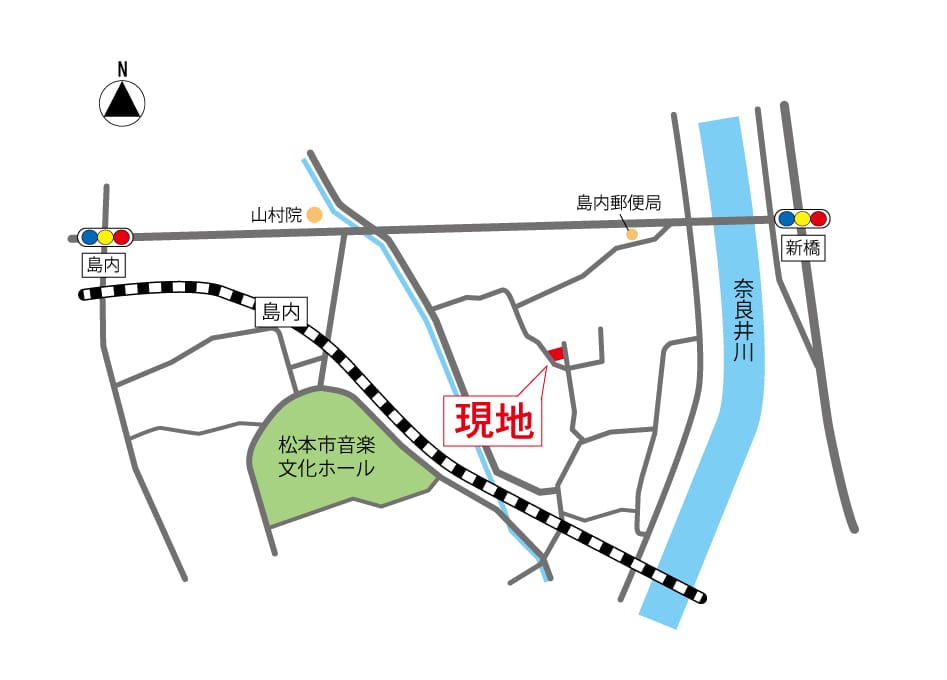 | 交通 | 電車:大糸線島内駅 距離450m 徒歩6分 自動車1分 電車:篠ノ井線松本駅 距離3400m 徒歩37分 自動車12分 バス:松本・島内線 バス停音文ホール(松本駅発着) 距離700m 徒歩10分 最寄り駅までバス乗車17分 高速道路:長野道 松本I.C. 車8分 |