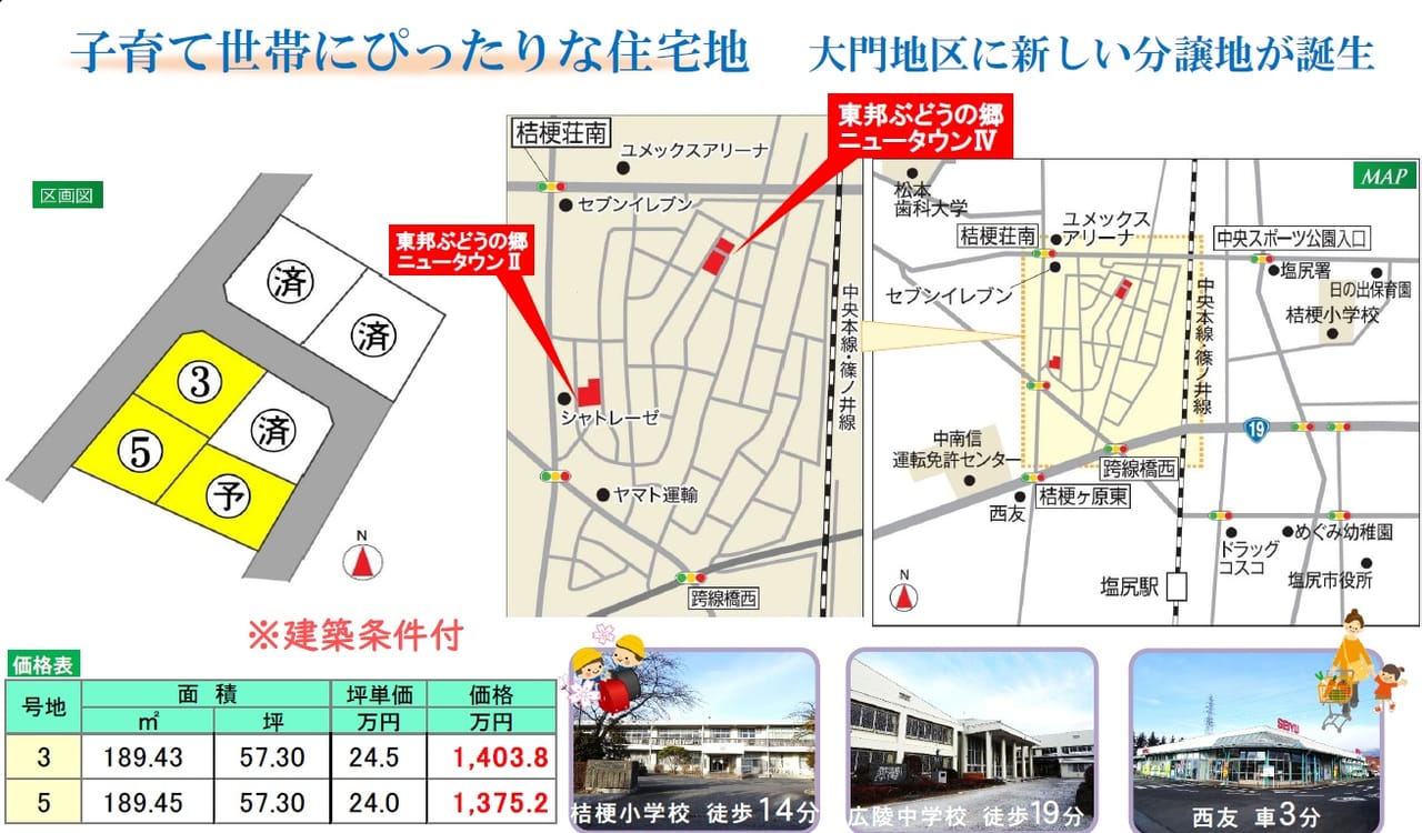 | 備考 | ■ 周辺環境 ━━━━━…‥・ ◯西友塩尻西店(約950m) ◯デリシア塩尻店(約1.8km) ◯セブンイレブン松本歯科大学前店(約350m) ◯とをしや薬局桔梗ヶ原店(約300m) ◯クスリのアオキ桔梗ヶ原店(約700m) ◯めぐみ幼稚園(約1.1km) ◯小口内科医院(約750m) ---------------------- ※東邦建工㈱の建築条件付き 売買契約締結後3ヶ月以内に東邦建工株式会社と建築請負契約を締結していただくことを停止条件として販売します。 万一、期間内に建築請負契約が締結されなかった場合、土地売買契約は無効となり、受領済み代金は無利息にて全額返還いたします。 ---------------------- ◎「東邦ぶどうの郷ニュータウンⅡ」も好評販売中です ■ご見学 現地にてご説明を兼ねたご見学も可能です。 ■モデルハウス ~松本市平田東~ お部屋を快適に保つ全館空調パナソニックテクノストラクチャー「ウィズエアー」 ~塩尻市広丘高出~ 東邦建工オリジナル高性能住宅 全館空調システムZ空調を搭載 アースカラー&木目の外観が特徴的です♪ |