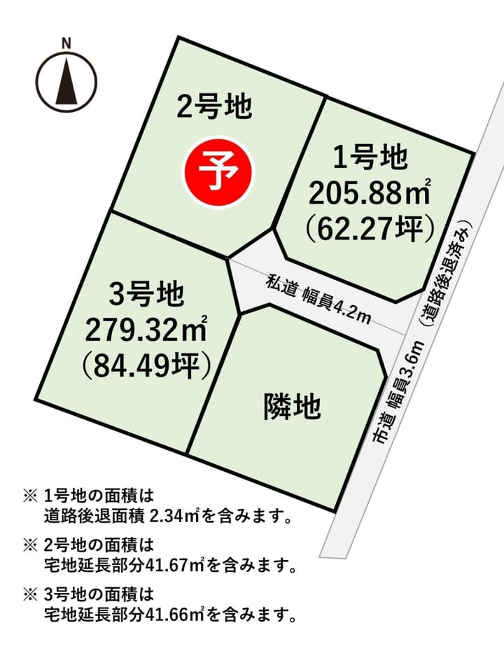 | 備考 | ・土地売買契約締結後、概ね3か月以内にホクシンハウス株式会社と建築請負契約を締結して頂くことを条件として販売いたします。この期間内に住宅の建築をしないことが確定した場合、または住宅の建築工事請負契約が成立しなかった場合は、土地売買契約は白紙となり、受領した金銭(手付金等)は無利息でお返しいたします。 ・セットバック2.34㎡(実質後退後面積は203.54㎡₋61.57坪) |