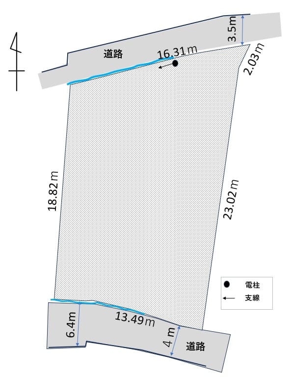 | 接道状況 | 方角:南 道路幅員:4m 公私区分:公道 接面:13.49m 方角:北 道路幅員:3.5m 公私区分:公道 |