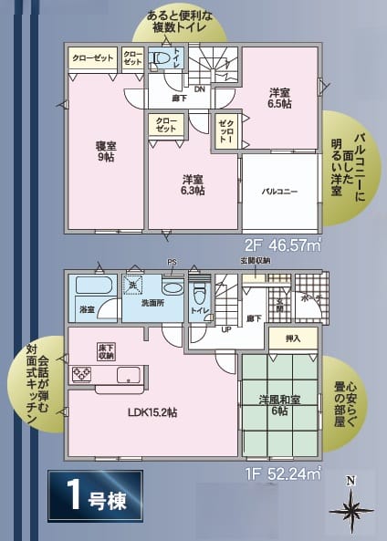 - 間取4LDK(LDK15.2帖、洋室9帖、洋室6.5帖、洋室6.3帖、洋風和室6帖)
