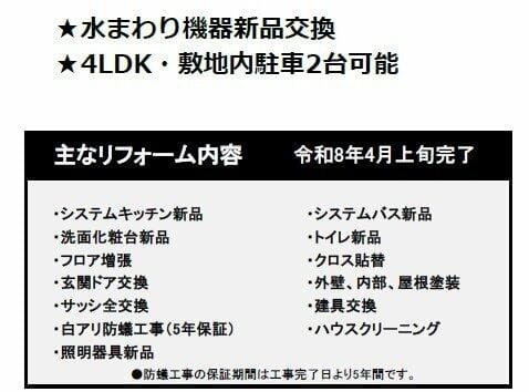 | 設備 | システムキッチン・温水洗浄便座・照明器具付き・プロパンガス・上水道・下水道・駐車場2台分 |