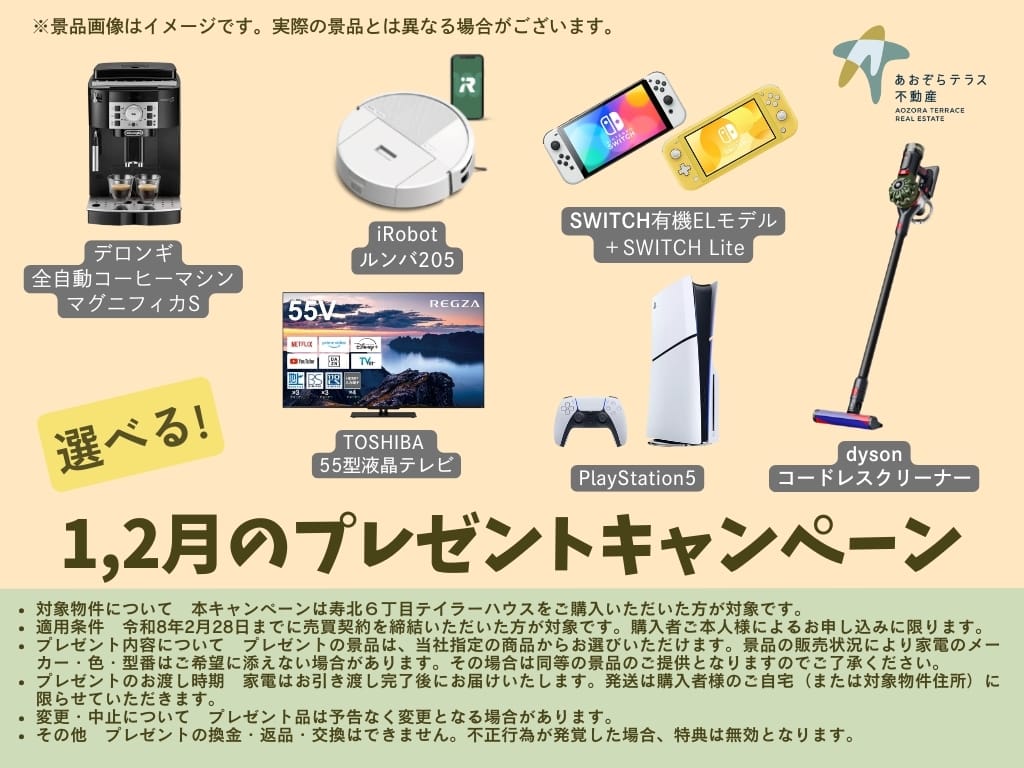 ご成約ありがとうキャンペーン!あおぞらテラス不動産で《テイラーハウス松本市寿北6丁目》をご成約の方に、毎日の暮らしがちょっと楽しくなる家電を1点プレゼント。※ナビゲーター説明動画あり