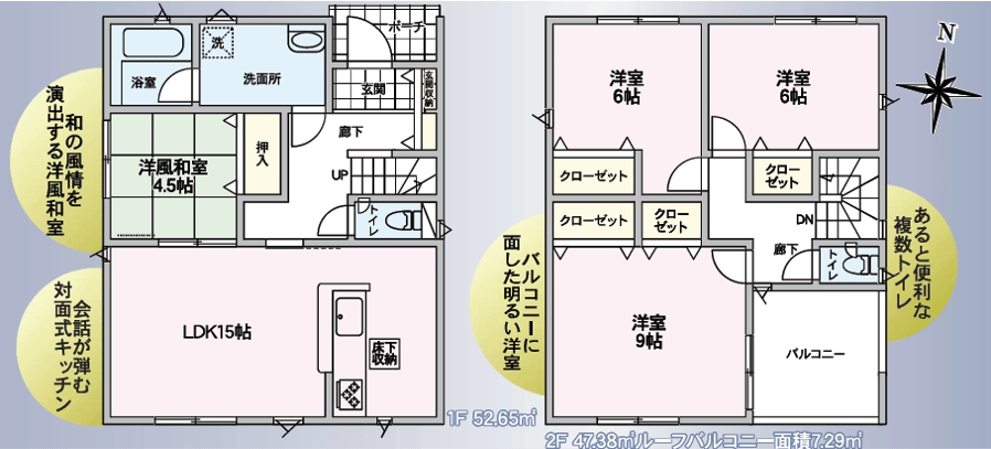 南向きで明るい15帖のLDKに、4.5帖の洋風和室が隣接。 2階の主寝室はゆったり9帖の洋室です。