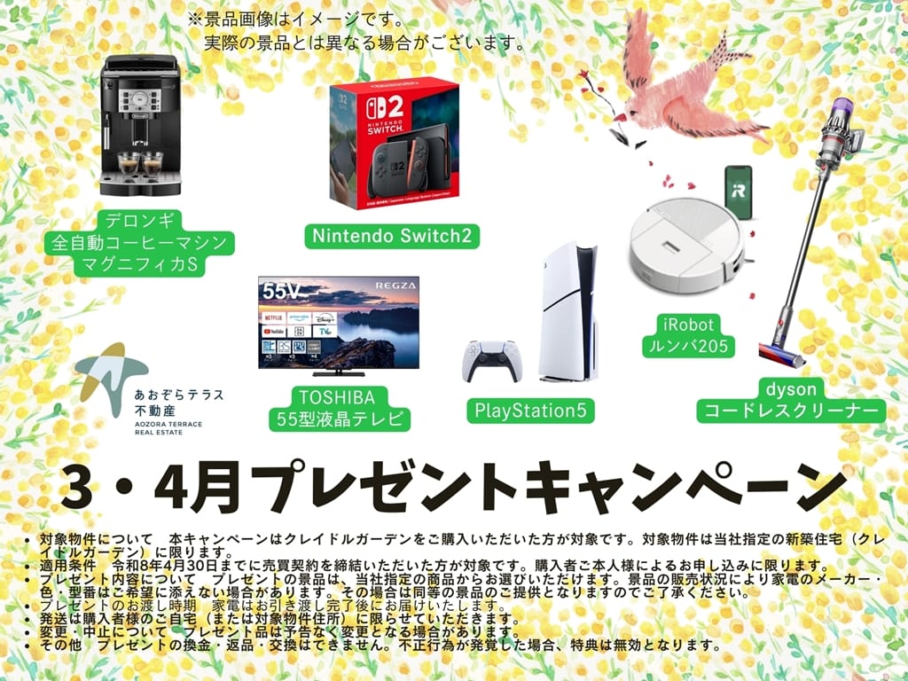 ご成約ありがとうキャンペーン!あおぞらテラス不動産で《クレイドルガーデンシリーズ》をご成約の方に、毎日の暮らしがちょっと楽しくなる家電を1点プレゼント。ぜひこの機会にご検討ください。