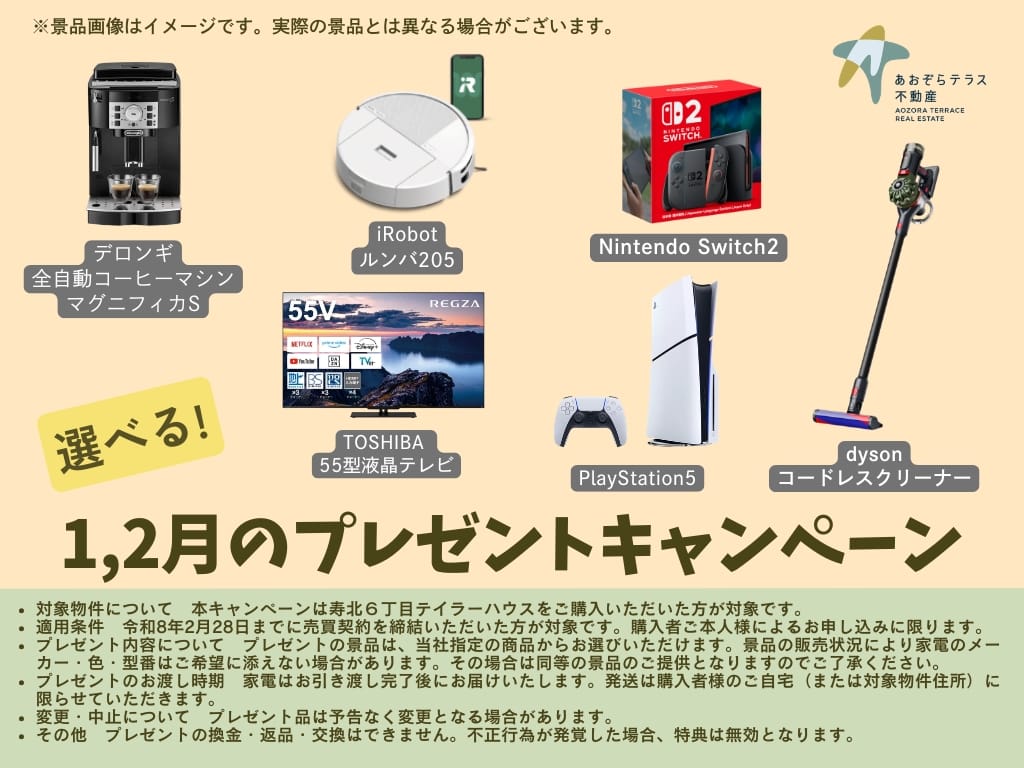 ご成約ありがとうキャンペーン!あおぞらテラス不動産で《テイラーハウス松本市寿北6丁目》をご成約の方に、毎日の暮らしがちょっと楽しくなる家電を1点プレゼント。※ナビゲーター説明動画あり
